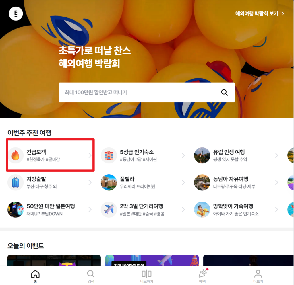메인 화면이나 검색 버튼을 누른 화면에서 “긴급모객”이라고 나와있는 아이콘을 Click하세요.