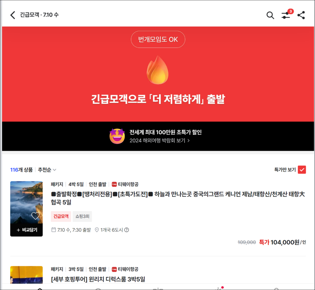 이런식으로 패키지 여행 특가를 확인하실 수 있습니다.